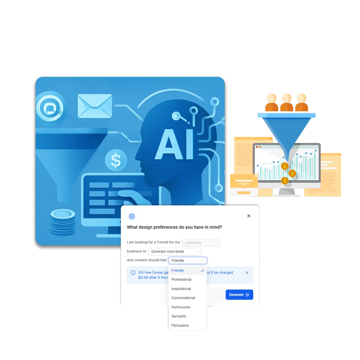 With Progreda’s Funnel AI, creating a sales funnel is actually super simple—no need for a designer or expert writer. Just enter some details about your business, and the AI will build the whole funnel for you, from getting leads to offering upgrades.